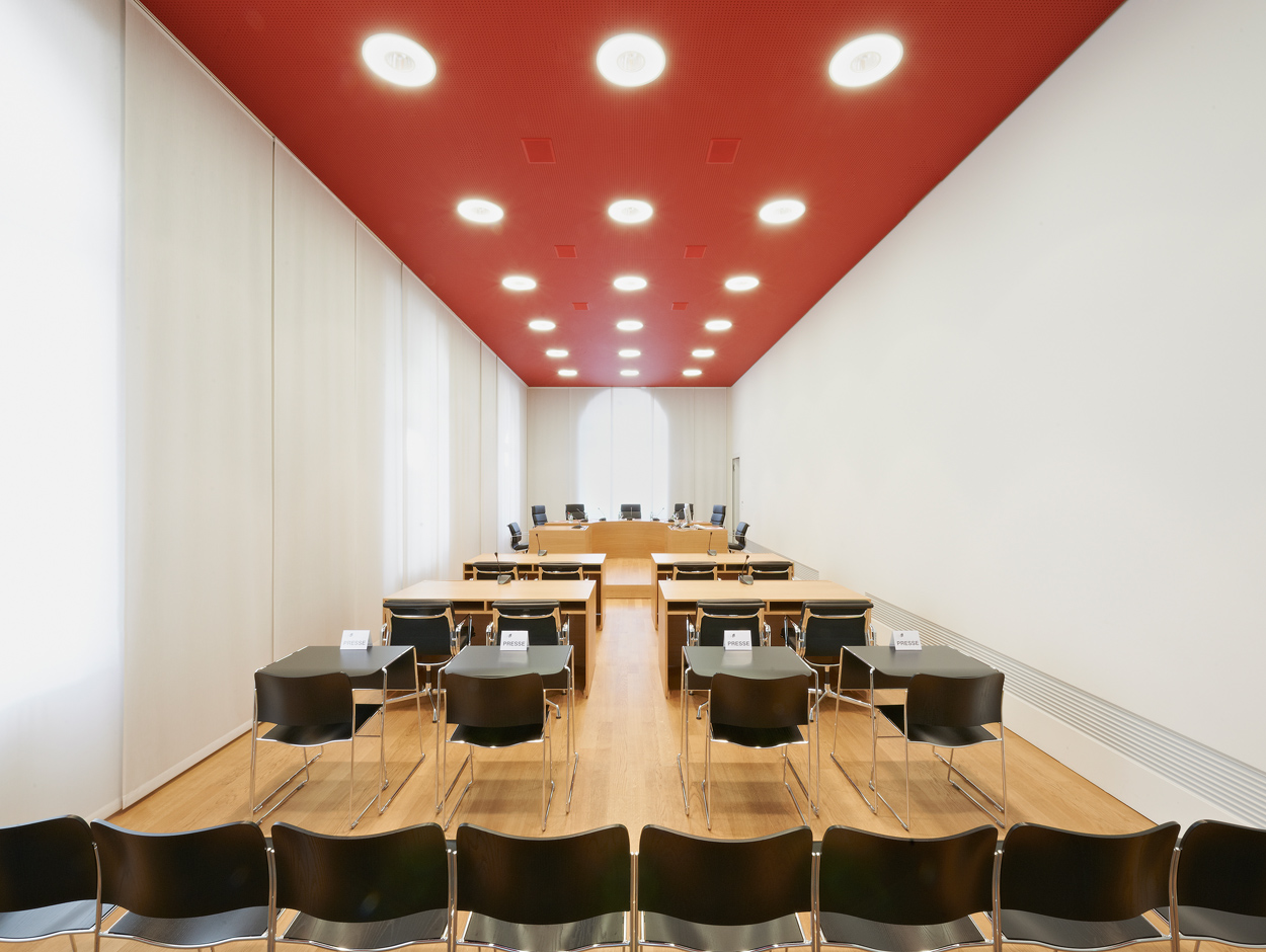 È la sala in cui si svolgono le udienze e i dibattiti aperti alle parti e al pubblico. Il pavimento in rovere, le pareti bianche e il soffitto fonoassorbente rosso danno un'impressione di lontananza e di vicinanza simultaneamente.