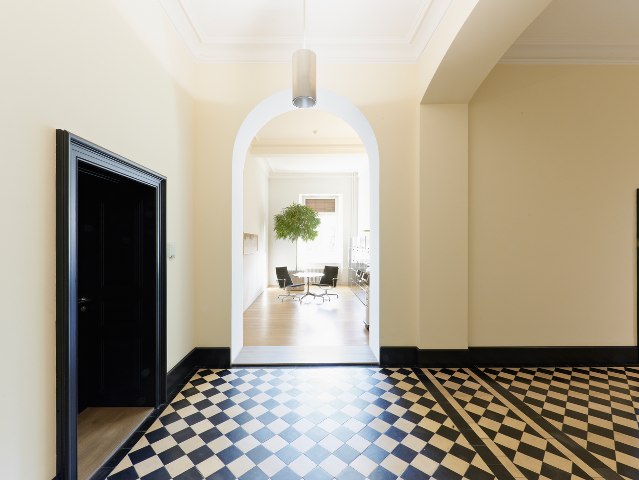 Il giallo caldo delle pareti del corridoio corrisponde alle marmorizzazioni storiche e richiama anche l'ocra delle piastrelle (terrazzo) risalenti all'epoca della costruzione.