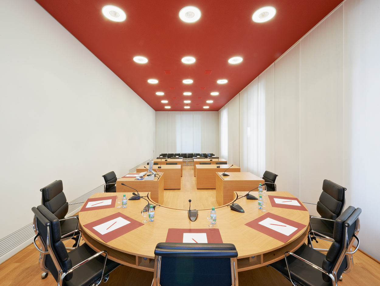 Ce local d'un rouge vif sert de salle de discussion et de délibération à la présidence et à la direction du tribunal.