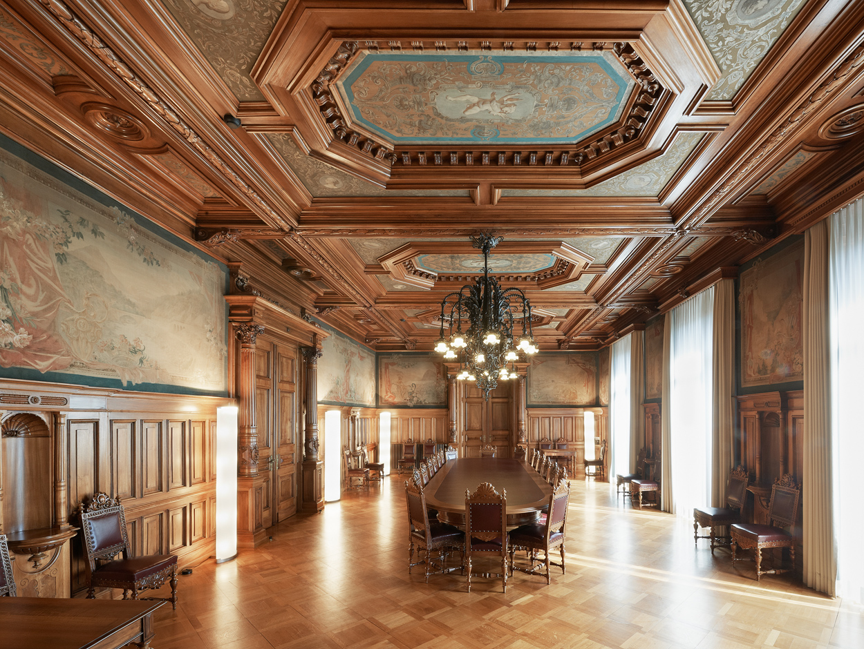 Les tentures murales peintes posées au-dessus des boiseries en noyer ont été nettoyées, restaurées et tendues sur de nouveaux cadres en 2002.
