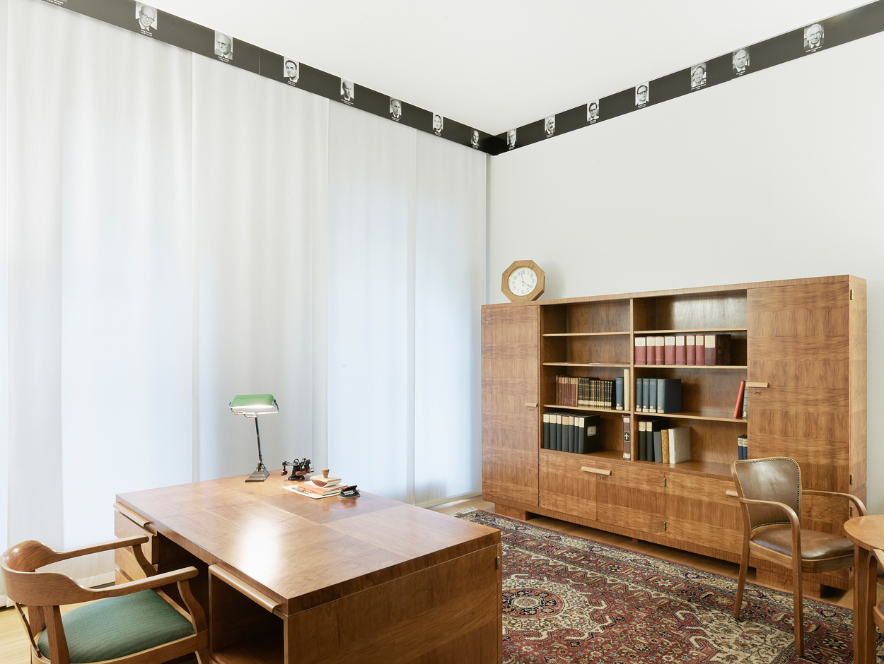Le jaune chaud des murs du corridor correspond aux marbrures historiques et se réfère également à l'ocre du carrelage (terrazzo), qui remonte à l'époque de la construction.
